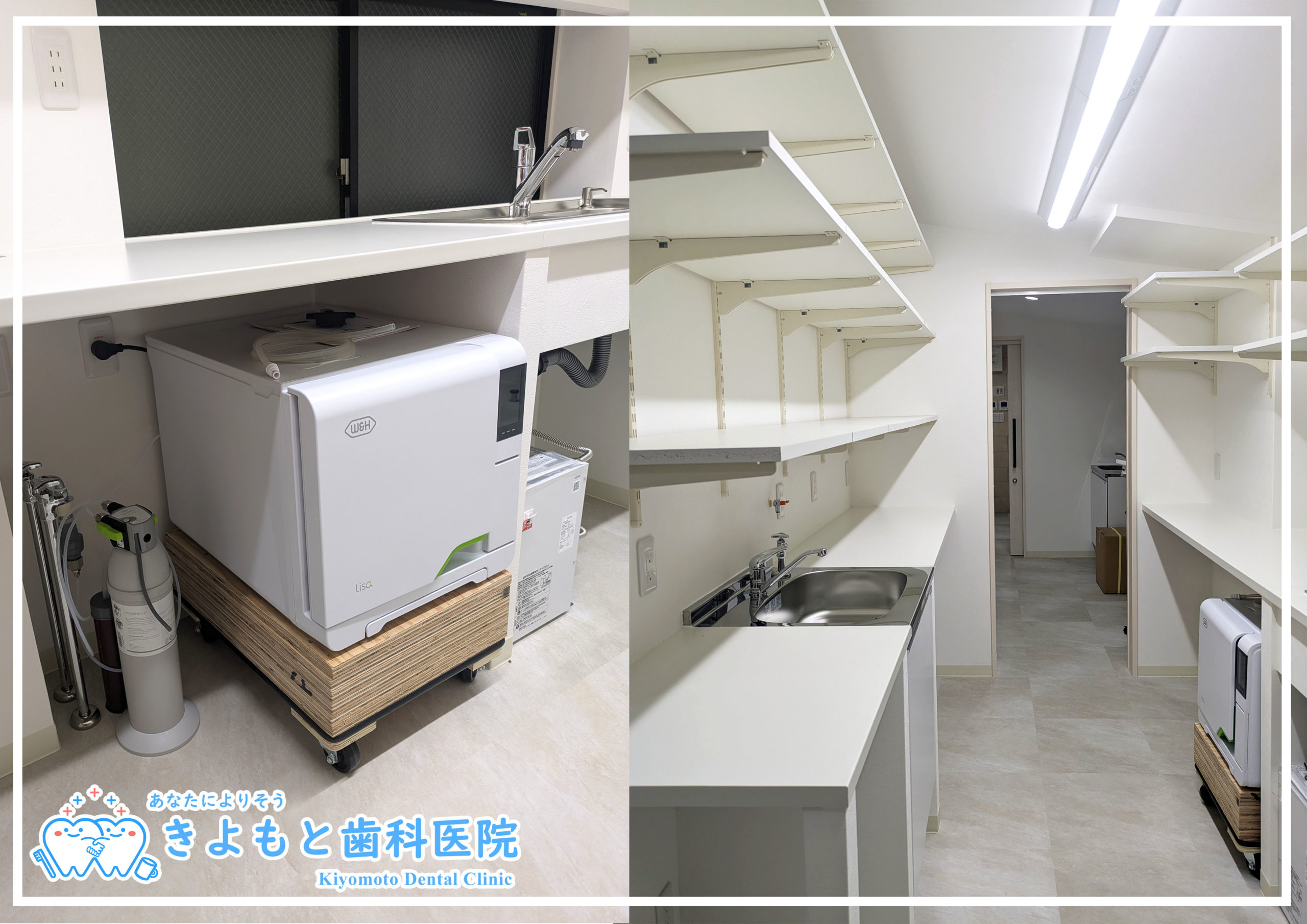 レントゲン室手前を左に曲がると、消毒室があります。ここでは歯科治療に使用する機材・器具の消毒・滅菌・保管を行っています。